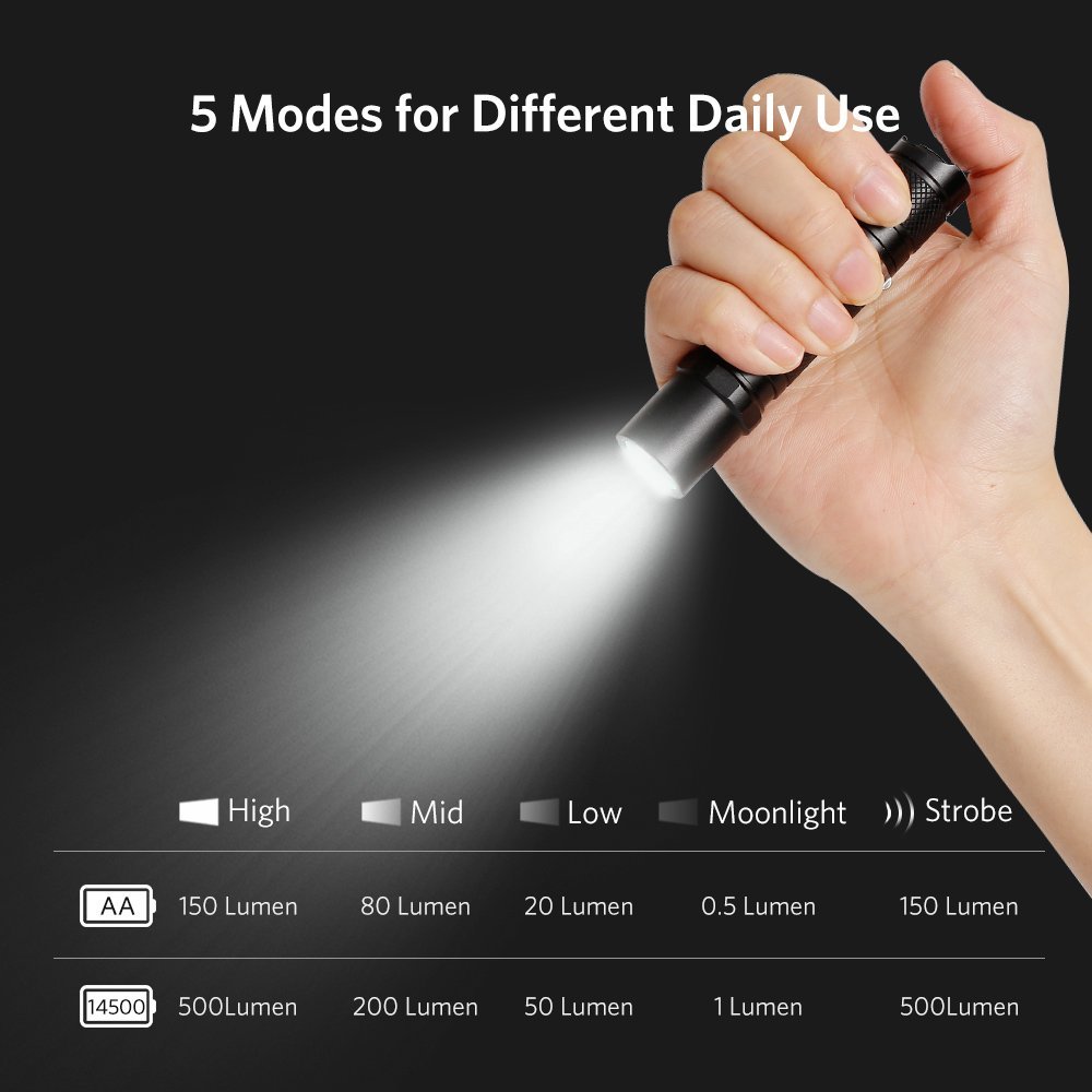 2,When powered by AA battery, the mini light gives out High(150LM) -Middle(80LM) -Low(20LM)-Moonlight (0.5LM ), and Strobe(150LM)